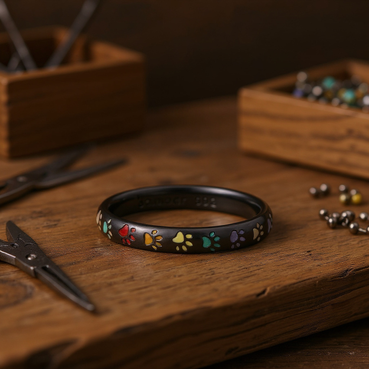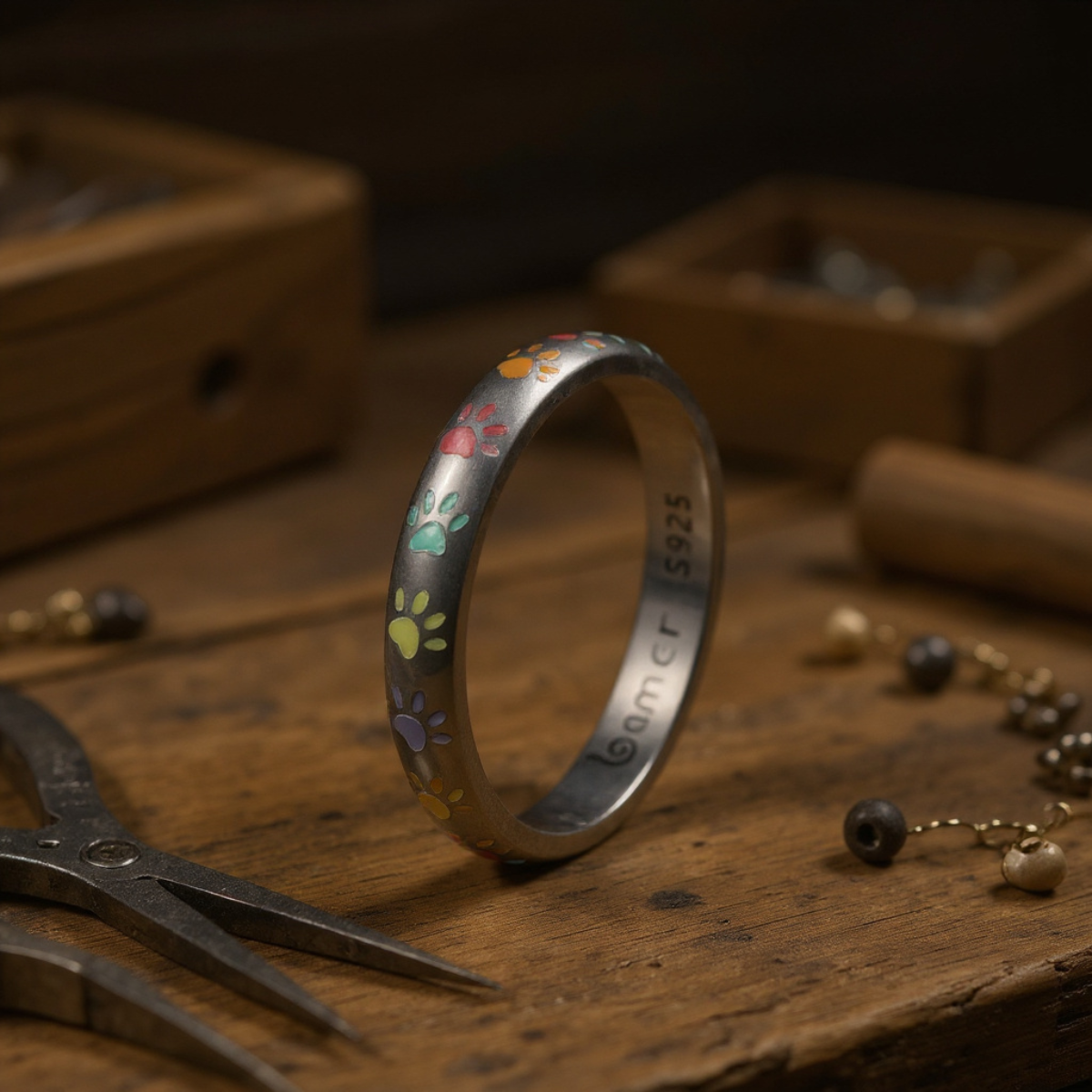 ๐Ÿพ Heartfelt Design โ€“ A colorful enamel paw print set against an oxidized silver band โ€“ a tender reminder of unconditional love and companionship.