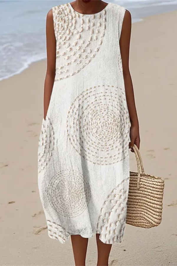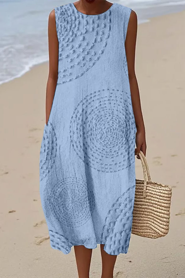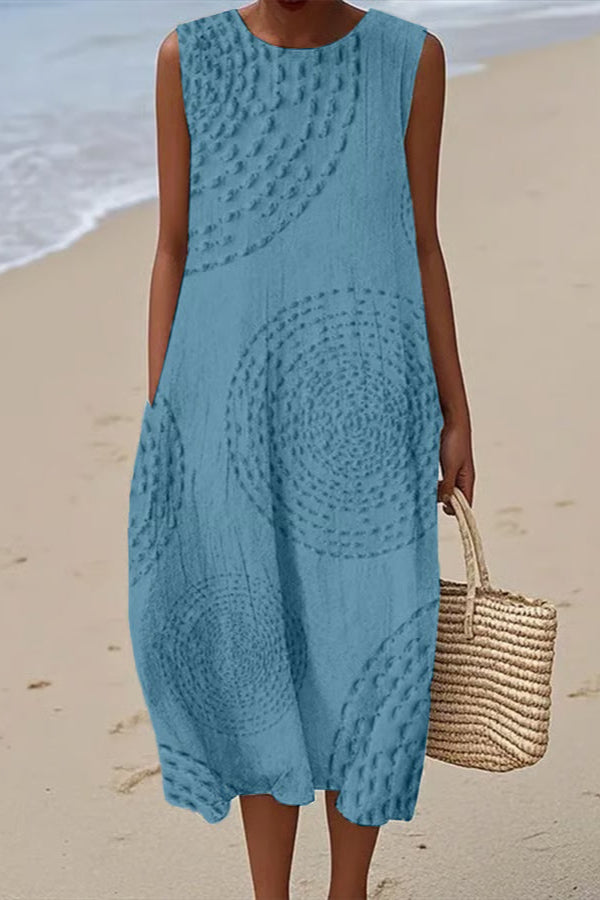 Przyjmij naturalny i kojący styl z sukienką Maelle | Długa sukienka bez rękawów z teksturowanym wzorem. Zaprojektowana z myślą o dniach na plaży i letnich spacerach, łączy w sobie komfort i minimalistyczną elegancję.