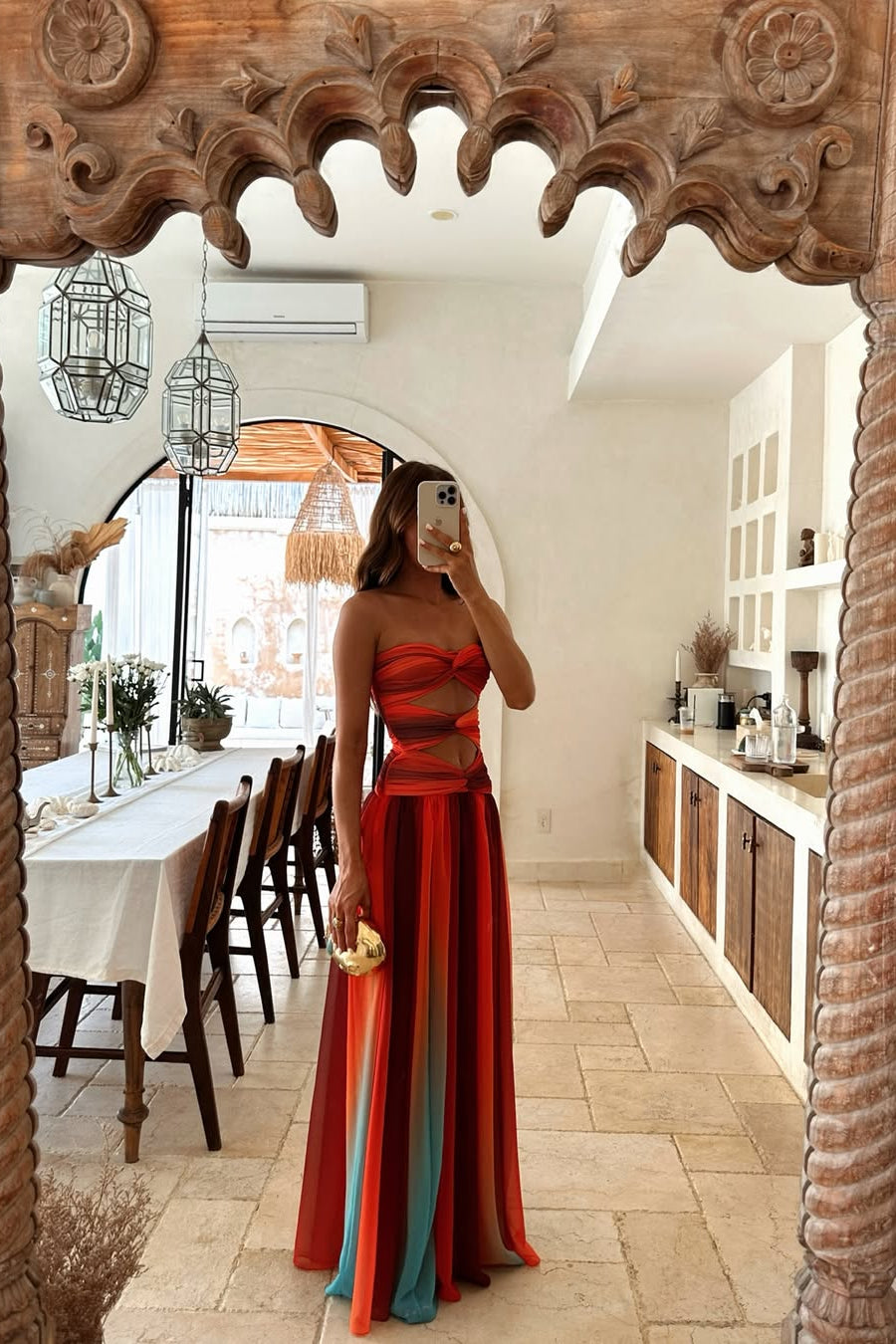 Sukienka Nirelle ucieleśnia bezwysiłkową elegancję z nowoczesnymi detalami, zaprojektowaną na chwile wymagające podniesionego stylu. Wykonana z płynnej, pełnej długości spódnicy, sylwetka porusza się z gracją przy każdym kroku, podczas gdy skręcony i drapowany gorset modeluje sylwetkę z rzeźbiarską finezją. Starannie umiejscowione wycięcia w talii dodają odrobiny nowoczesnego uroku, równoważąc strukturę i miękkość w doskonałej harmonii.