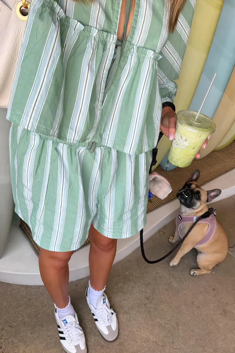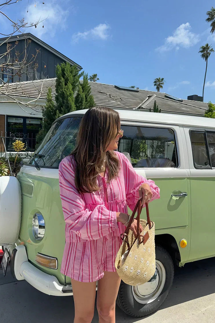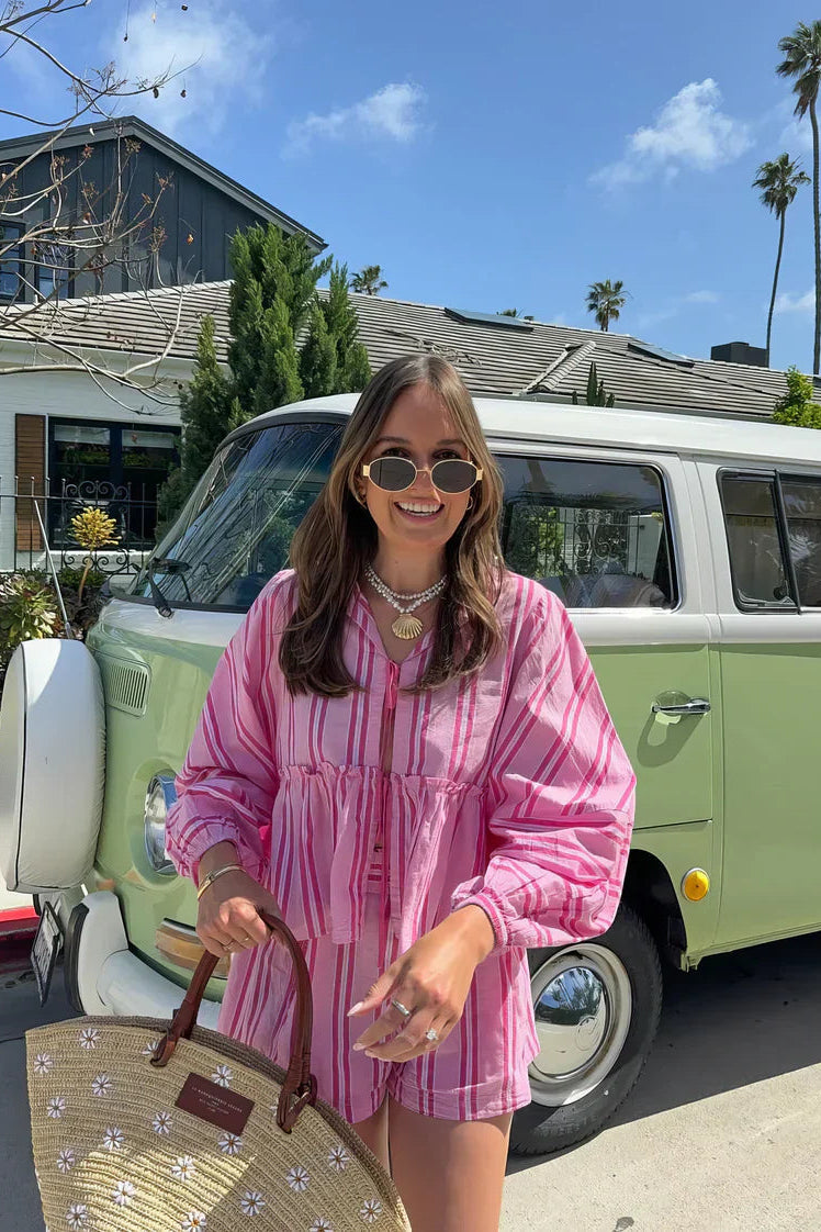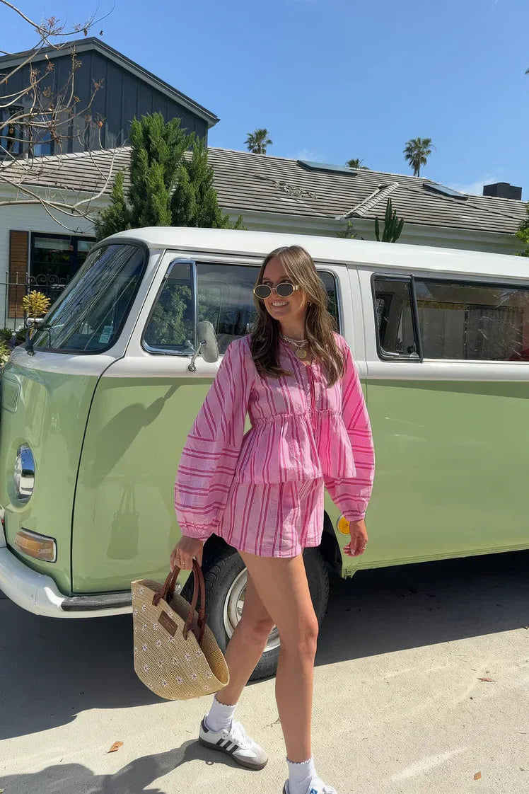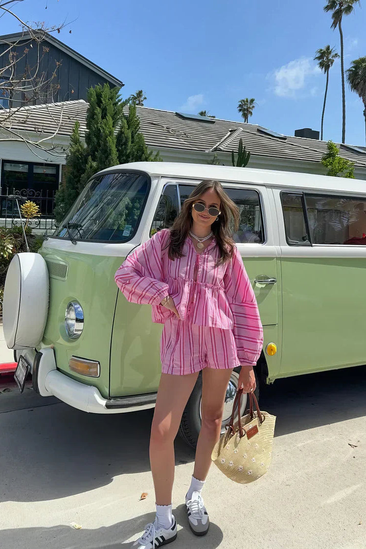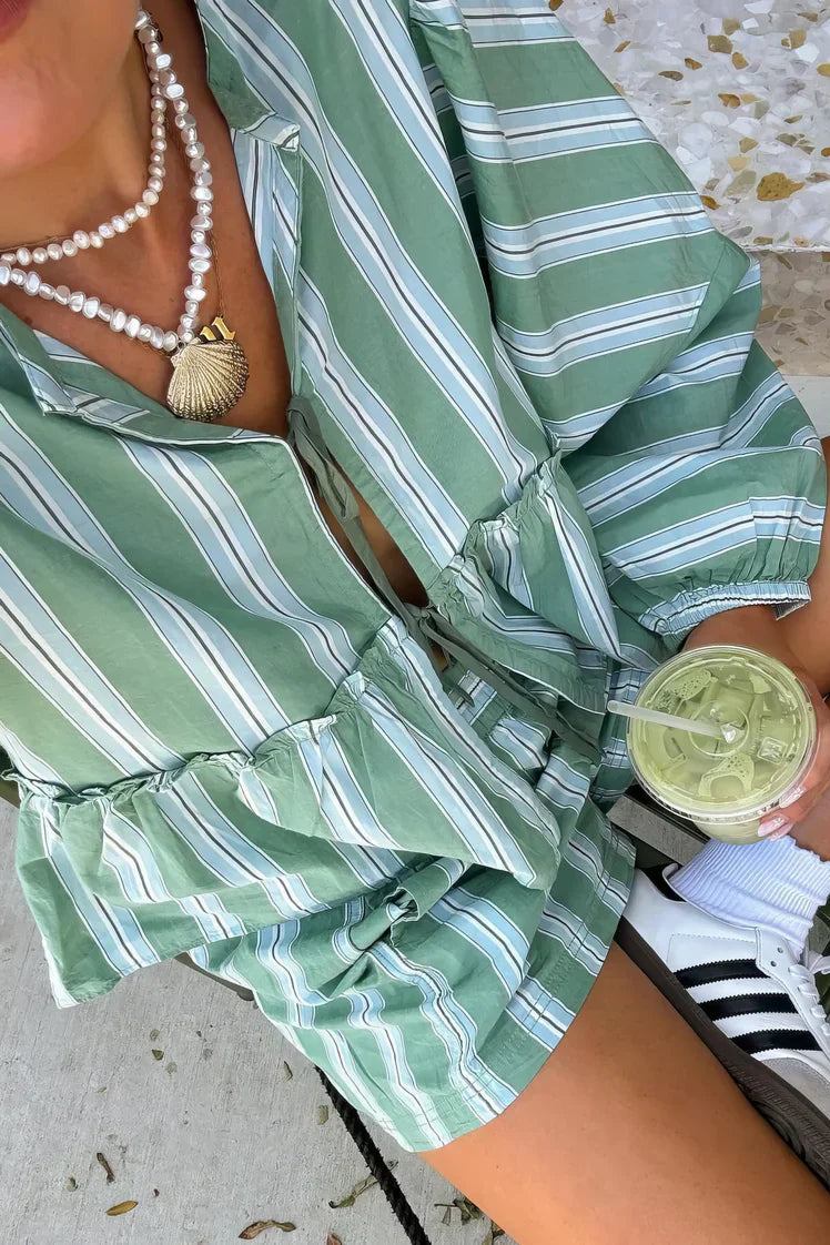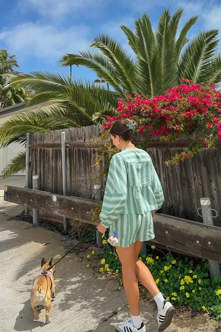 Ta Grażyna | Letni komplet  łą wygodę i wesoły wygląd. Luźna bluzka z bufiastymi rękawami i ściągaczem subtelnie podkreśla talię, a pasujące szorty zapewniają swobodne dopasowanie. Oryginalne paski i przewiewny materiał sprawiają, że jest to idealny look na ciepłe wiosenne dni i duszne letnie wieczory.